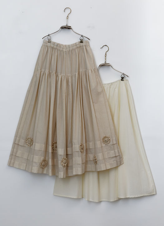 Cotton underskirt. Could be worn with or without. Hand embroidered flower motifs in grosgrain ribbons.