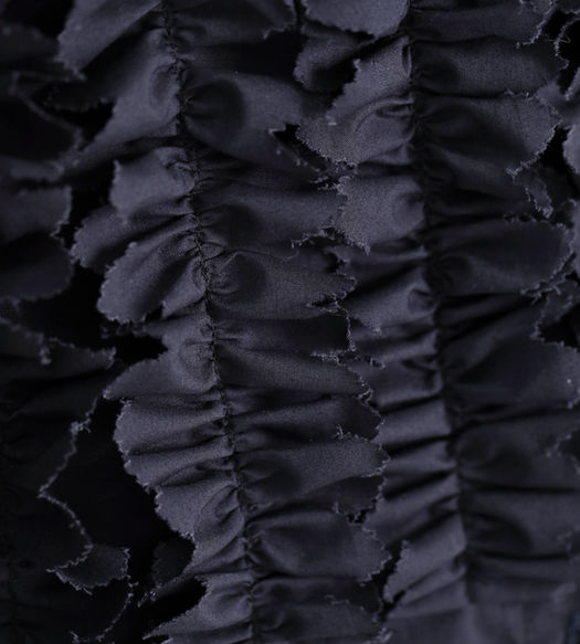 A sleeveless top with a small rounded stand collar, featuring a ruffle trim with raw wedges that are hand-cut using a mid-19th-century antique trim cutter. The French placket closes with vintage glass buttons.