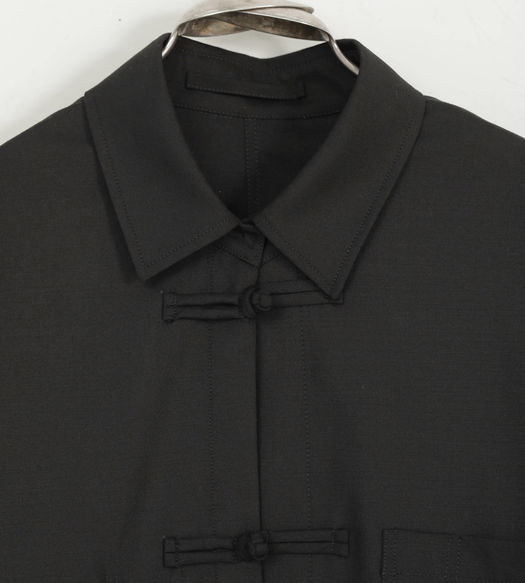 A workwear-inspired collar jacket featuring a traditional four Pan Kou Chinese button closure. The jacket showcases a relaxed, loose silhouette with dropped shoulders and wide sleeves, creating a modern yet effortless shape. It includes three patch pockets and an inner breast. Crafted from lightweight tropical wool providing breathable comfort and a refined drape.